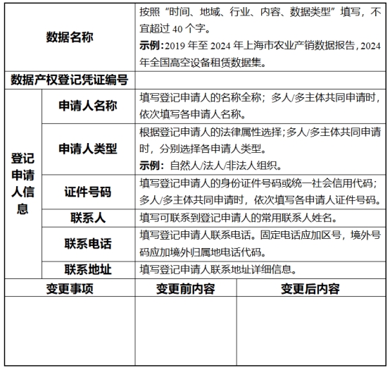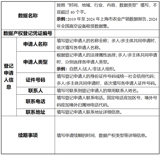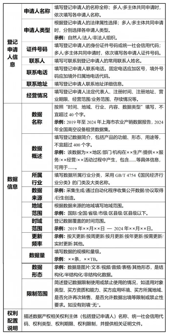申请办理初次登记的,登记申请人应当提交初次登记申请表(参考模板见附件1)、登记申请人身份佐证材料、数据产权合法取得的佐证材料,以及数据样例和数据描述等材料。