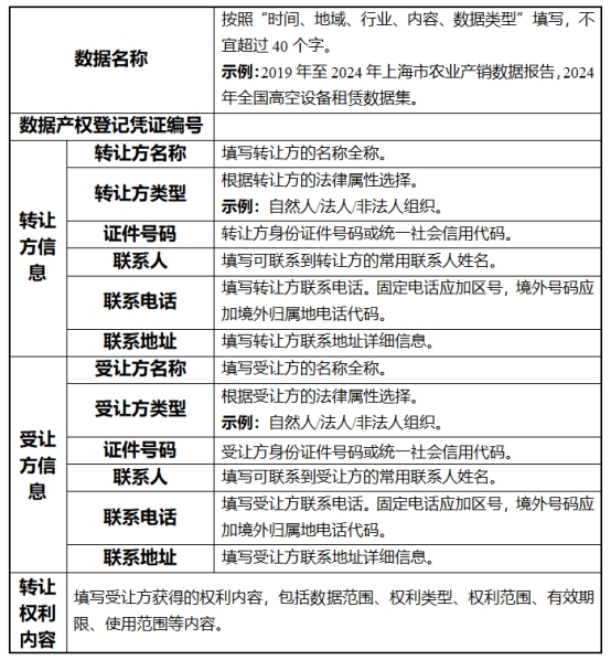 申请转让登记的,登记申请人应当提交转让登记申请表(参考模板见附件2)、转让合同、初次登记凭证等材料。登记机构受理转让登记并审查通过的,应当相应调整转让方的数据产权登记凭证。