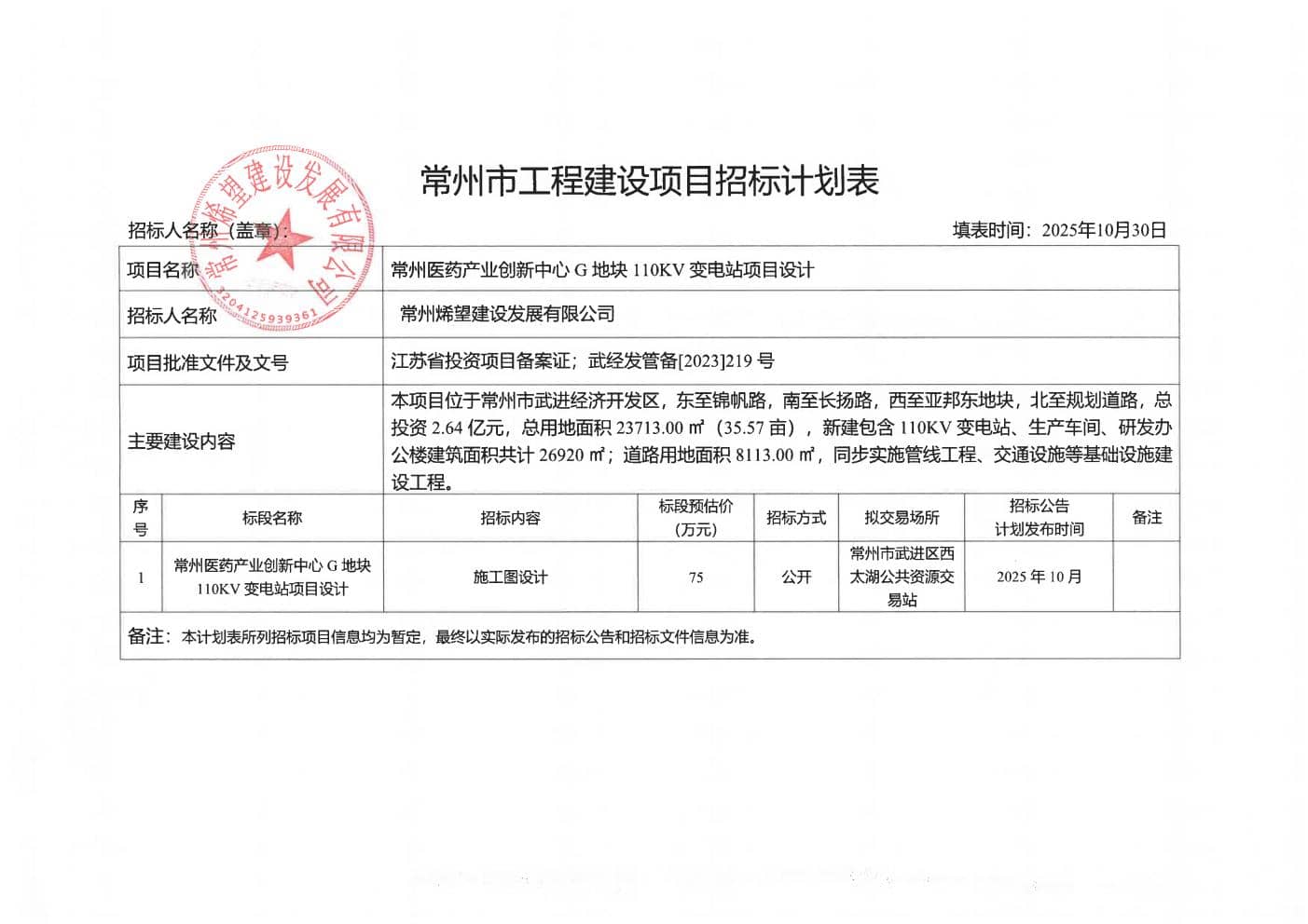 常州医药产业创新中心G地块110KV变电站项目设计招标计划