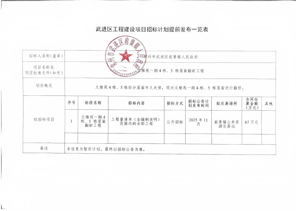 文雅苑一期4栋、5栋屋面翻新工程招标计划