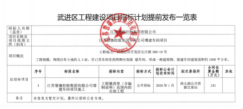 江苏慧德控股集团有限公司增建车间项目施工招标计划