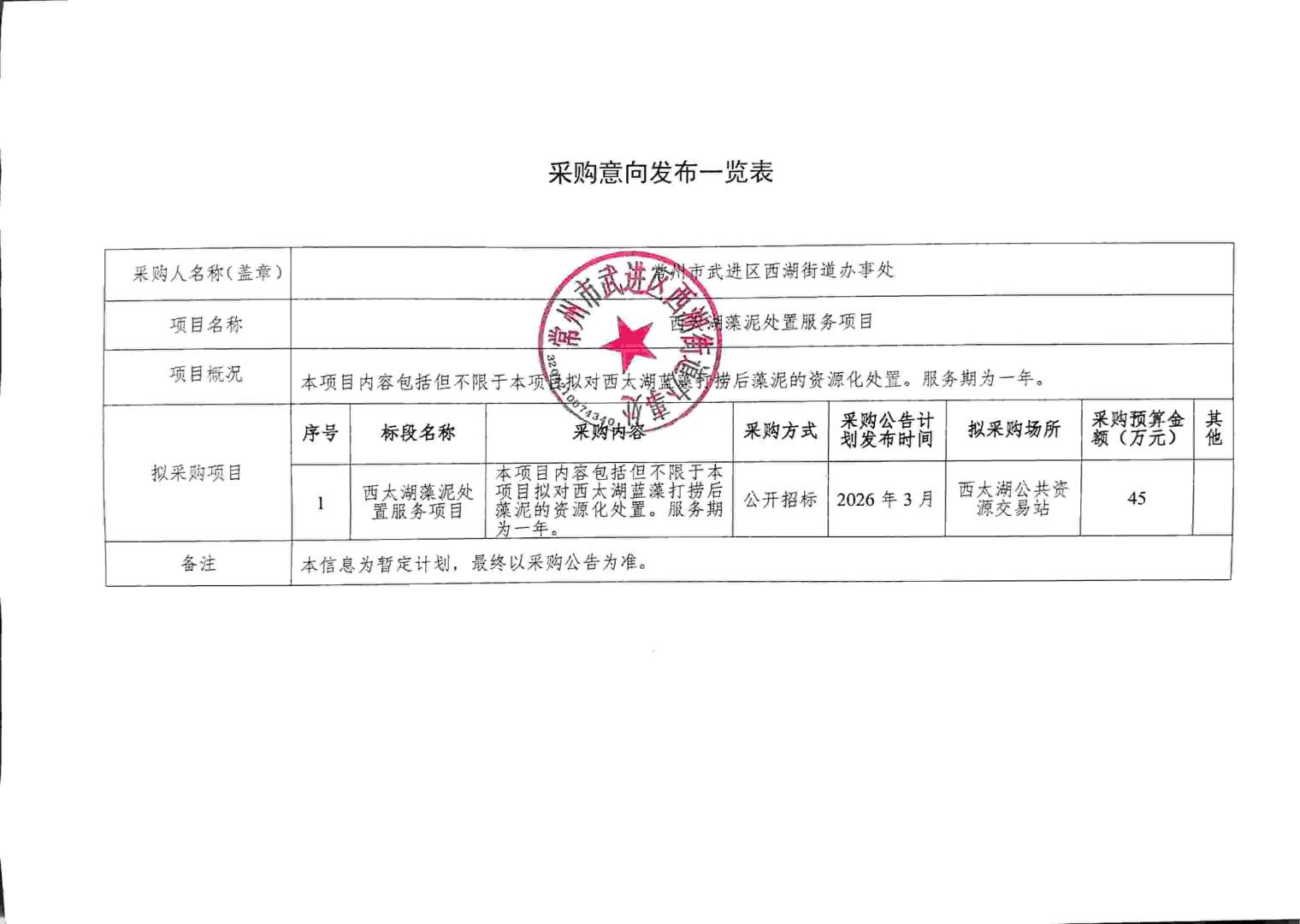 【西太湖】西太湖藻泥处置服务项目采购意向