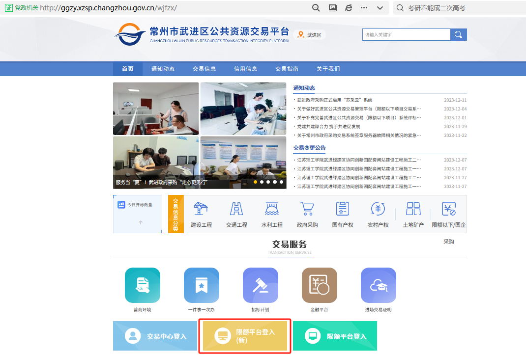 自2024年1月1日起,正式切换启用部署在常州市级政务云的武进区公共资源交易管理平台(限额以下项目交易系统)。系统域名变更为: