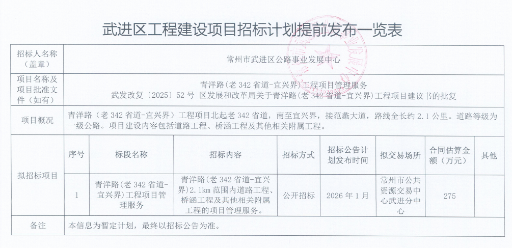 青洋路(老342省道-宜兴界)工程项目管理服务招标计划