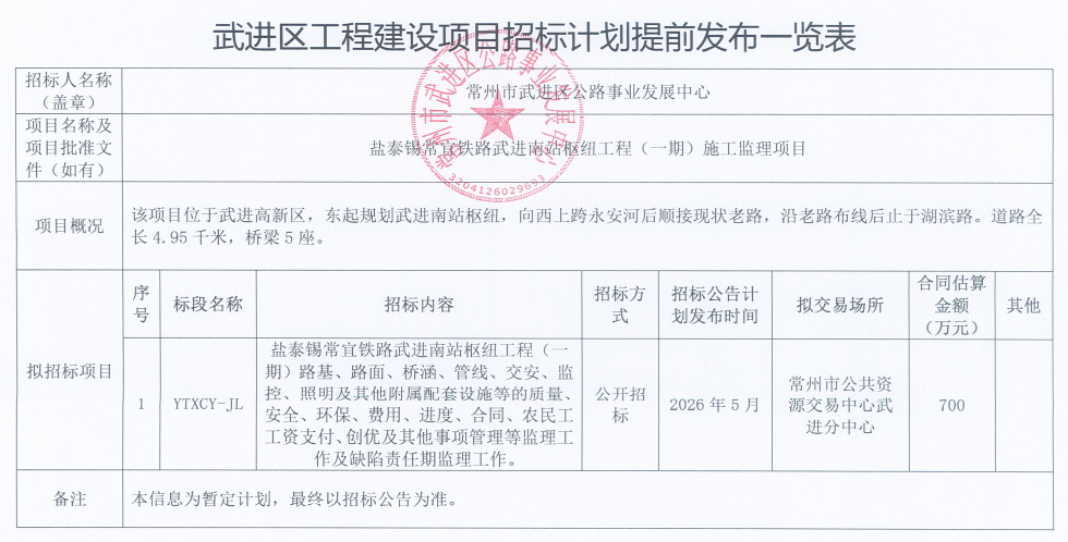 盐泰锡常宜铁路武进南站枢纽工程(一期)施工监理项目招标计划